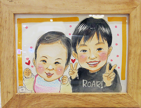 こちらは似顔絵初めてのご依頼でした。迷って迷って描かせていただきましてありがとうございます!妹ちゃんに甘々なお兄ちゃんが可愛かった〜。これからも2人で仲良く喧嘩したりしながら成長するんでしょうね。楽しみですね。またよかったらご来店お待ちしてま〜す。