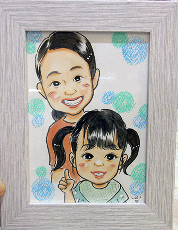 似顔絵は初めてという親子さんでした。とってもキュートなお子ちゃまが大人しくしててくれて