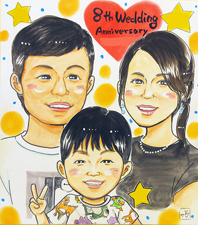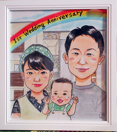結婚記念日に家族の似顔絵を描かれるということで、今年はいおりやが描かせていただきました。とっても元気な僕に、素敵なご夫婦さんでした。