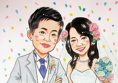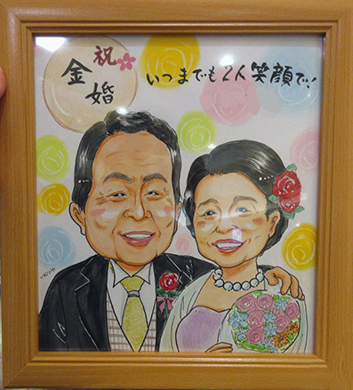 ご両親の金婚式祝いにというご依頼で、ウェディング風に描かせていただきました。