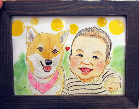 こちらはお子さんと柴犬姫との似顔絵をご依頼いただきました。