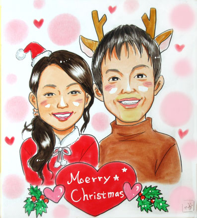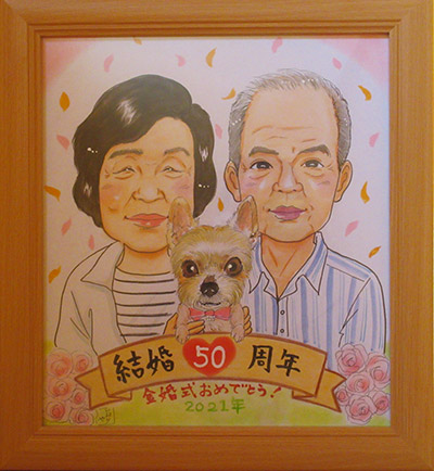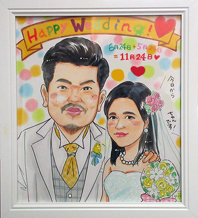 とても個性的なお二人楽しく描かせて頂きました。プレゼントとのことですので、喜んでいただけるかな〜とドキドキです。お二人の未来が素敵な時間となりますように。