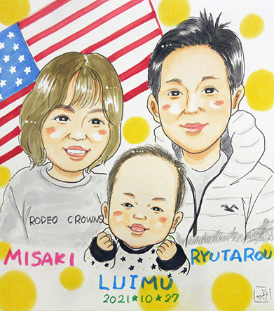 初めての家族似顔絵のご依頼でした。生後1ヶ月のお子さんとの3人家族さんでした。これがまた玉のような男でして、きっと光源氏ってこんな感じだったんじゃないの〜?!と思うくらいに、高貴で幸せオーラのある赤ちゃんでした。私も癒されました〜〜〜。