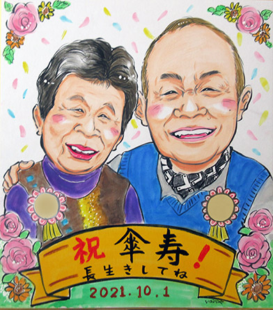 こちらは、お急ぎのご依頼をいただいたお客様その1。米寿のお祝いに。色紙サイズですが、額が大きいので結構ゴージャスに見えますね。額があると似顔絵のクオリティがちょっと高くなるので、プレゼントにするときは、額をつけるのがお勧めです。