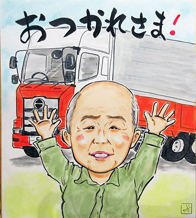 退職するおじいちゃんへのお祝い似顔絵のご依頼でした。ごついトラックを初めて描きました笑。これからの人生の楽しみを満喫してくださいね〜。