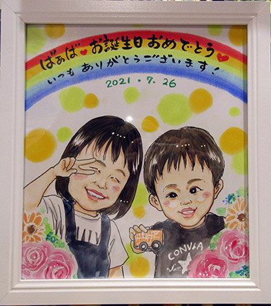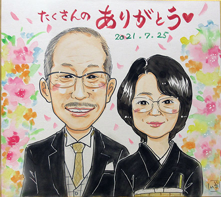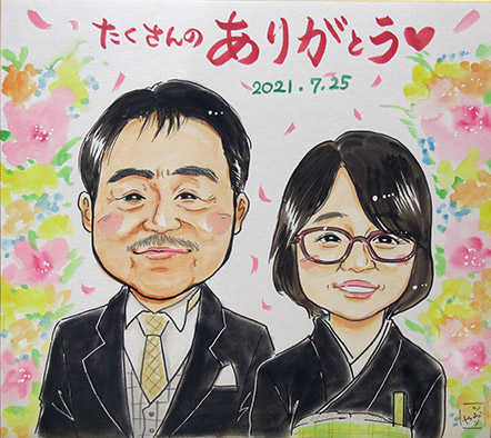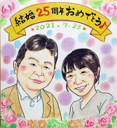 こちらの似顔絵は、10年前に15周年の記念にと似顔絵を描かせていただいたご夫婦の娘さんたちが、ご両親の25周年記念にプレゼントしたいのでというご依頼でした!まさかまさかの10年越しの似顔絵ですね〜。嬉しいですね。ぜひ次も10年後にお待ちしております。