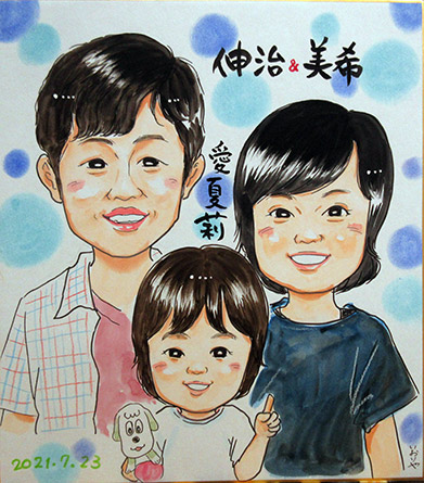 こちらのご家族は、リピーターさんで毎回ご家族で描かせていただいております。娘ちゃんも成長していて前回は赤ちゃんっぽかったのに、もうしっかり幼児になってました。子供ちゃんの成長が知れるのも、この仕事の醍醐味だな〜と思います。次に会う時も楽しみですね。
