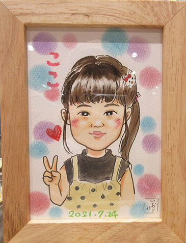 こちらは、帰省のたびにご来店くださり、似顔絵を描かせていただいております。高畑充希似と勝手に私の中では思っているいのですが、小顔でクリっとしたお目目がと〜〜〜っても可愛いのです。そして、年々女の子らしさもUPしていて、描かせてもらってすごく幸せ〜って思いながら描いてます。コロナ禍でなかなか会えませんでしたので、再会できて嬉しかったです!また次回も楽しみにしてますよ〜。