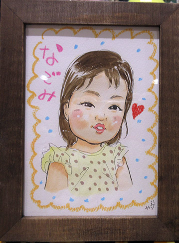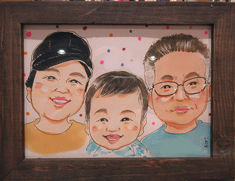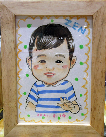 こちらもミニ似顔絵のご家族版。ミニはキツキツで3名までです。笑顔になかなかなってもらえなかったのですが、お母さんの一言で会心の笑顔。可愛くてたまりませんね。こちらもたまたまですが8ヶ月のお子さんでした。