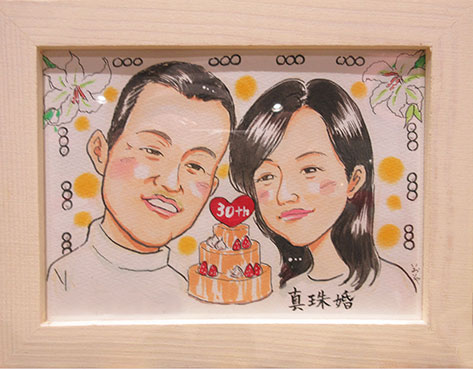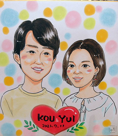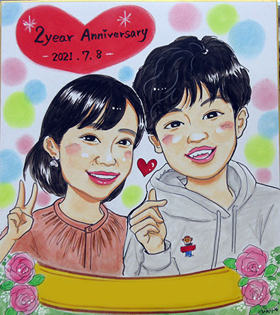 こちらはカップルさんの記念似顔絵です。とても初々しくて羨ましい感じのお二人でした。是非三年めもお待ちしております!