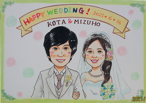 ウェルカムボードは、通常色紙サイズが多いのですが、お式でB4も飾るにはちょうど良いかなと思います。この後この似顔絵はまたちょっとしたコラボで最終的にはまたちょと違う形になるので、私もどうなるのか楽しみです。