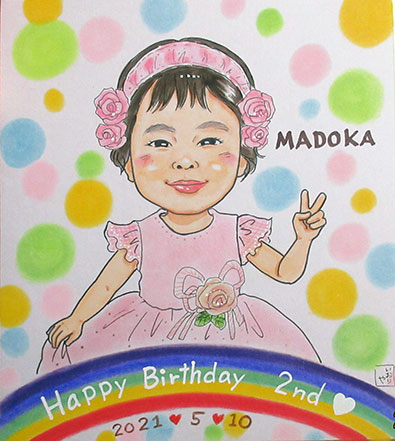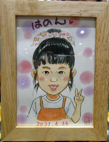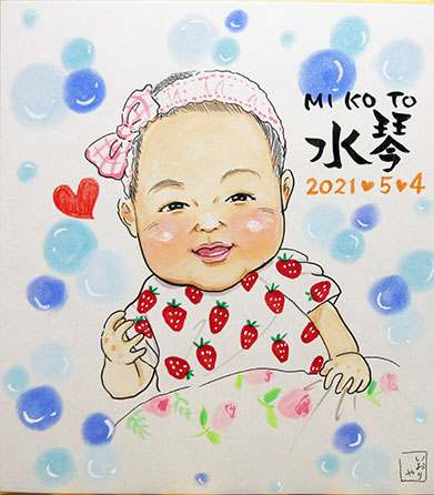 日頃高年齢ばかりを描いていたので、久しぶりの赤ちゃんを描くのはドキドキでしたねえ。喜んでいただければ嬉しいな。ぜひこれからの成長の折に、似顔絵を描きに来てくださいね!ありがとうございました。