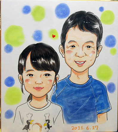似顔絵初めてさんの親子さんでした。絵を描くのが好きなお子さんのため、初めての似顔絵を描かせていただきました。娘ちゃんは、絵画教室で習っているそうでお上手なんだそうです!独学の私の技法が役に立つのか・・・?と思いつつも、楽しんでいただけたようで何よりです。本好きだということでいろんな本のお話をしました!