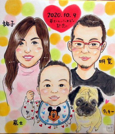 こちらは、ご家族さまでお子さん誕生日記念ですね。ご実家で飼われているパグちゃんも一緒に。人生初パグを描きました。どきどきです。