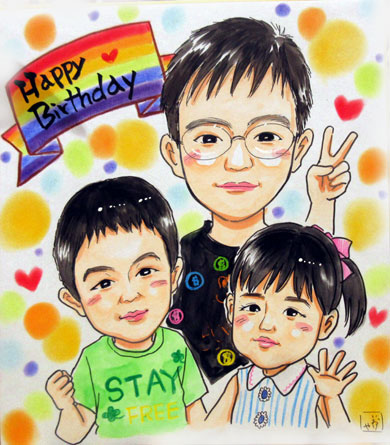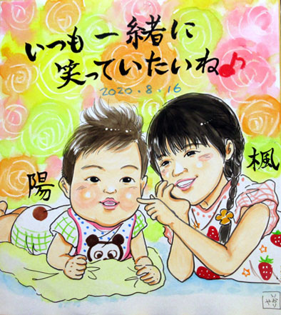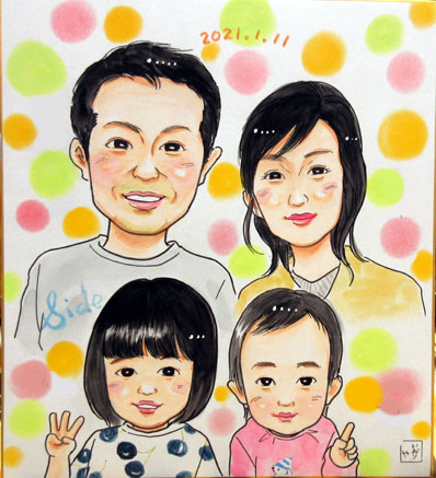 こちらはご家族似顔絵です。妹ちゃんが生まれて初めての似顔絵だとか。やはり、家族が増えると似顔絵も新しく更新していただきたいですよね〜。ありがとうございます。これからも賑やかで楽しいお家生活を過ごしてくださいね。