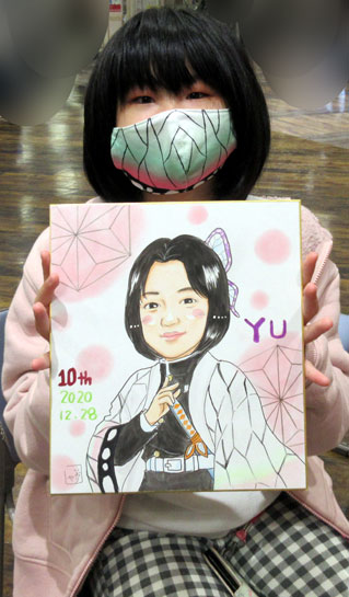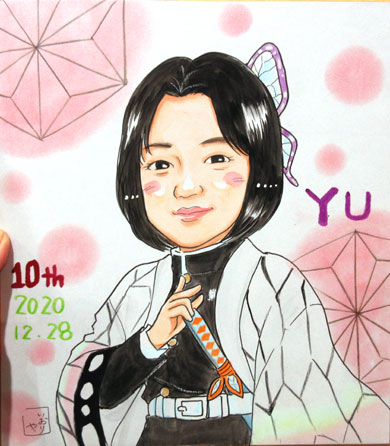 こちらはリピーターのお客様。毎年お誕生日のお祝いに描かせていただいております。今年は・・大人気の鬼滅コスプレということでした。さすが大人気の作品ですね。昨年から、ちょっとずつお客様のご依頼でいろんな知識が増えましたけど、またよくわかってないのでごめんなさいね〜。着物柄・・・描きながらぐるぐるしてました。模様が。