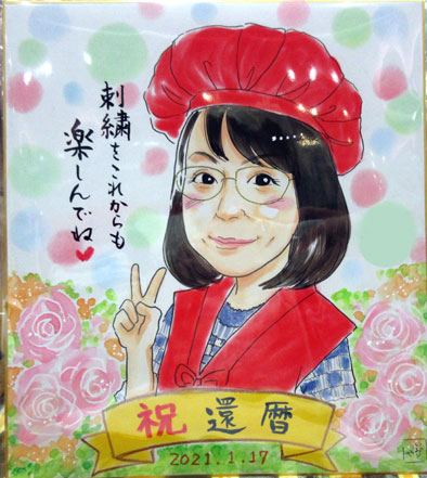 還暦祝いその一。だいたい一日一回はご依頼をいただく年寿祝いの似顔絵ですね。とっても刺繍が大好きなお母様。まだまだ還暦といってもお若いので、ぜひこれからの人生も楽しんでいただきたいです。