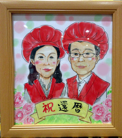 こちらは還暦祝いその二。ご夫婦での似顔絵還暦祝いです。残念なことにだんな様はもうお亡くなりになっていらっしゃるということで、似顔絵の中でのコラボです。これからもだんな様の分まで元気に楽しい人生を送っていただきたいです。