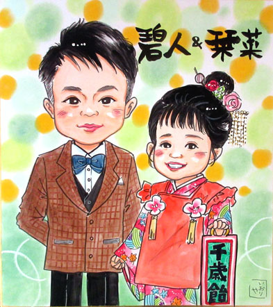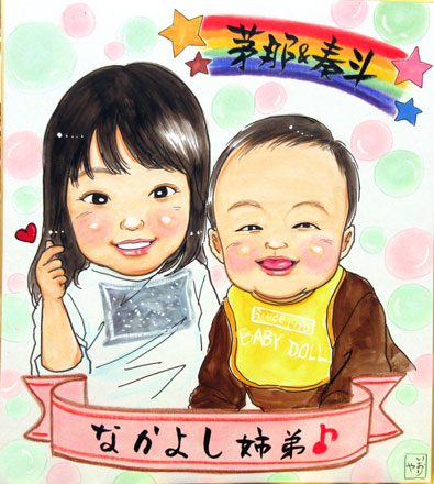 以前にも描かせていただきましたリピーターの方のご依頼です。今回は弟君が生まれたのでということで、二人の似顔絵をご依頼いただきました。