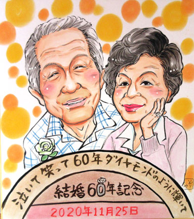 こちらは、記念似顔絵です。素敵なご夫婦でずっと話しながら似顔絵を描かせていただきました。いろんな人生があって興味深かったです。ぜひ、来年以降も似顔絵を増やしていってくださいね!