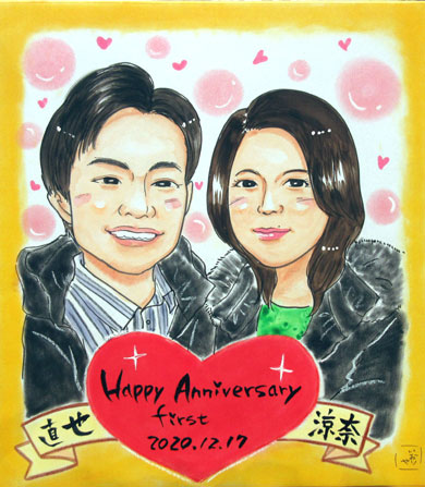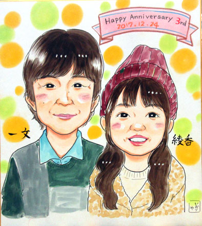 こちらもカップルさんの記念似顔絵です。素敵な笑顔を見せていただきました。ありがとうございました。一年一年を素敵な時間にしていってくださいね〜。またお待ちしております。