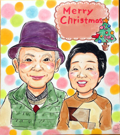 祖父母へのクリスマスプレゼントにと言うご依頼でした。とってもかわいらしいお二人に、微笑ましくなりながら描かせていただきました。こんな風に素敵なご夫婦になれたらいいなあと思うようなお二人でした。