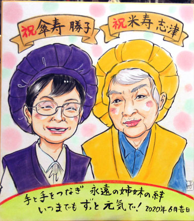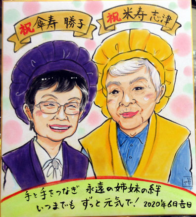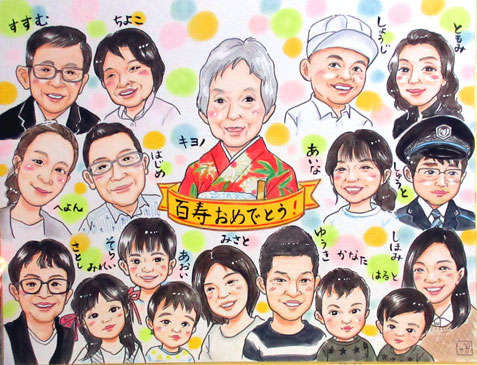 めでたくも100歳の曽祖母さんへのお祝い似顔絵だそうです。家族一同の