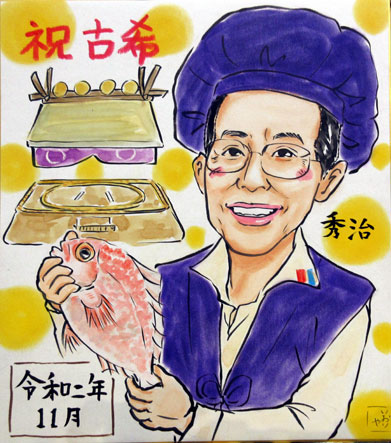 こちらはお父さんへのお祝いだそうです。お魚屋さんをしていてお相撲好きとのことでしたので、お好きなものを取り入れて描いてみました!これからも元気で美味しいお魚をたくさん