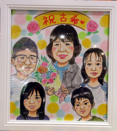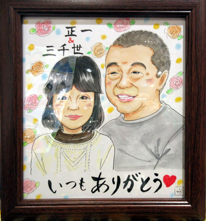 ご両親のプレゼントということでご依頼をいただきました。還暦のお祝いですが、わりと普通の感じで描かせていただきました。