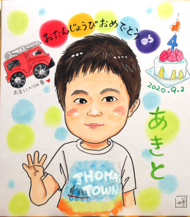 もうすぐお誕生日なので記念似顔絵です。今大好きな消防車をだいじに抱きししめてきてくれました。これからも元気2遊んでね。