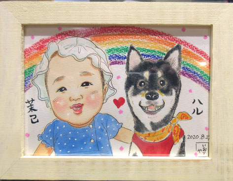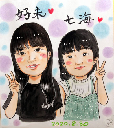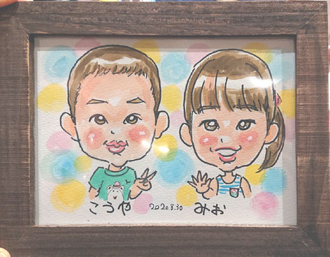 こちらは姉妹ちゃんですね。いろんなところで似顔絵を描いてもらっているとかで、コレクションも随分たまったようです。いおりやの作品も追加していただきありがとうございます〜。