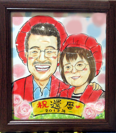こちらは還暦祝いのご依頼でした。同級生のご両親へというちょっと遅ればせながらのプレゼントだそうです。お父さんの笑顔は珍しいというお写真で、とっても幸せな笑顔に描きながら、満面の笑顔を誘発したのはなんだったのかめっちゃ気になりました笑。