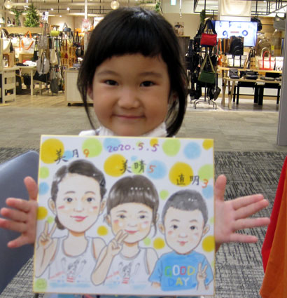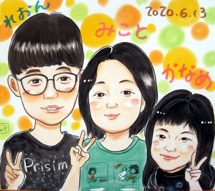 1日目。三兄妹ちゃんの似顔絵をご依頼いただきました。いつもはUSJで毎年描いていただくとのことですが今回は昨今の事情により『似顔絵いおりや』へご依頼をいただきました!