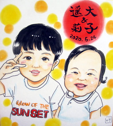 こちらは仲良し兄弟の叔父様へのお誕生日記念にとのこと。男兄弟でご高齢ですが元気でお互いにとても仲が良いそうです。お話を聞いてもとても心温まるお話で、似顔絵を描かせていただきました。お二人がこれからもいつまでもお元気でいてくださることを願っております。