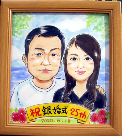 こちらはご両親の銀婚式のプレゼントにということで、これまた素敵な若者?!三兄弟からのご依頼でした。いろいろと三人で悩みながら決めてのご依頼でした。この日は結構若い男性からご両親へのご注文が続き、みなさんとっても素敵なご両親に育てられたんだなあとほんわかした優しい気持ちになりました。似顔絵がその橋渡しができるなら幸せですよね〜。ご依頼ありがとうございました。