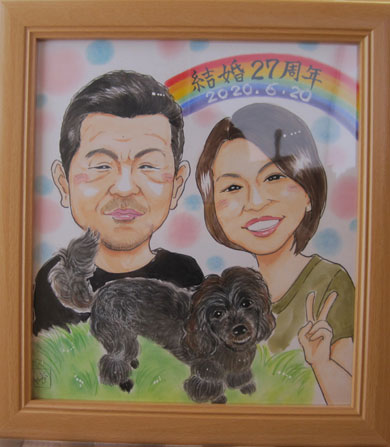 ラストです。こちらは結婚記念のお祝いにということで、お子さん達からご両親へのプレゼント。愛犬ちゃんと一緒にということで、ミックスのわんちゃんを描かせていただきました。