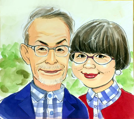 水彩画で絵本のような可愛い似顔絵やリアルな似顔絵など幅広い作風で優しい似顔絵を描いてくださいます。