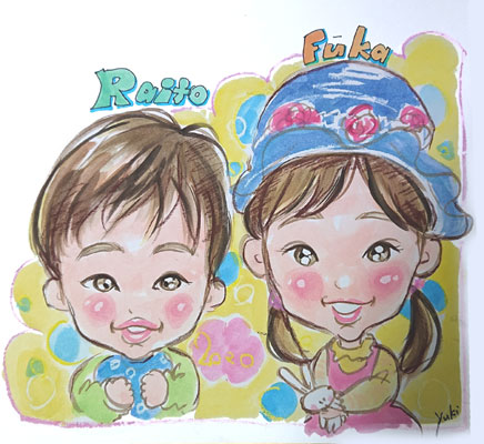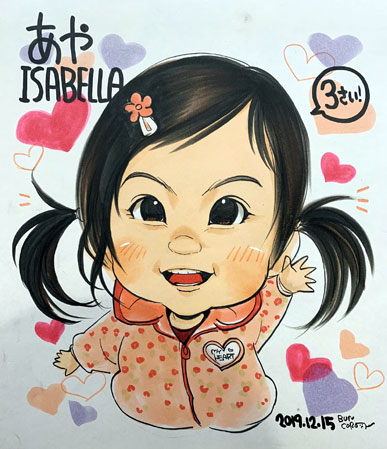 コピックと水彩を使い、きらきらゴージャスな似顔絵や可愛くて微笑みの優しい似顔絵をかいてくださいます。子供や赤ちゃん、ご家族などに喜ばれています。