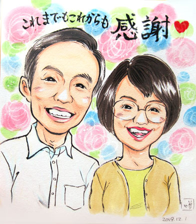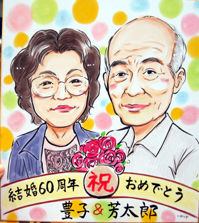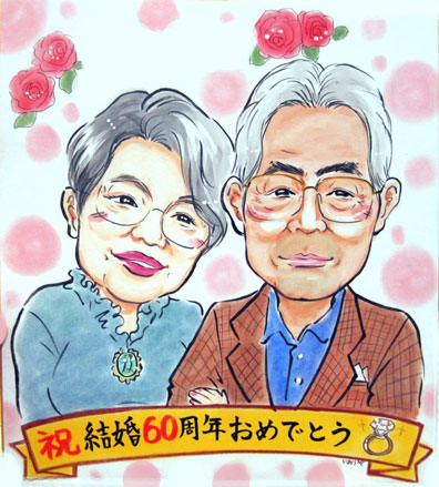 結婚60周年記念のお祝い似顔絵です。とっても味わい深りご夫婦です。ダイヤモンドの輝きのように、たくさんの思い出に包まれた素敵なご夫婦になりたいですね。