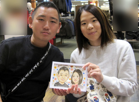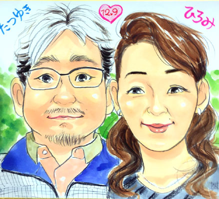 こちらは新婚さんの似顔絵です。初々しいお二人のお話を聞いて、うらやまし〜と思いつつ、