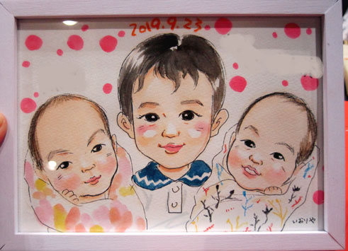 こちらはミニ似顔絵。生後間もない双子姉妹と一緒に三姉妹似顔絵です。