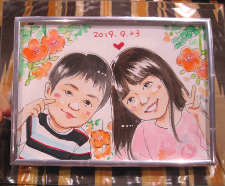こちらは熟年夫婦さんの似顔絵。とっても味のあるお顔のお父さん。いおりや的には三日間一楽しく描かせていただきました。いつかこんな風に味わいのある夫婦になりたいものです。